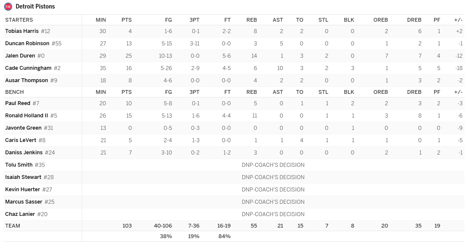 Ausar Thompson: Thompson has been playing at a high level for a couple of months now, but games like this are still going to happen down the stretch. His role is still shaky, and that gives him a low floor, especially against stronger teams. While Thompson will be a frustrating hold, he will be a must in all leagues the rest of the way due to his upside and the Pistons’ schedule. Even if he has the odd 20-minute night, he’ll still produce solid numbers on a totals basis due to Detroit’s elite schedule. Over the last month, Thompson has been a top-70 nine-category asset thanks to an incredible steal rate (2.5 SPG) and some solid numbers in boards (5.5 RPG), assists (3.5 APG), and FG% (50.0 FG%).