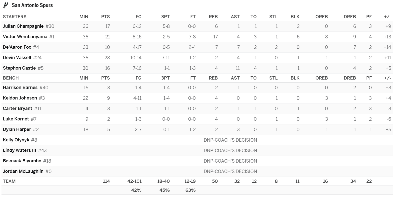 Julian Champagnie: The Spurs rolled with a playoff rotation in this game, which led to more minutes than usual for Champagnie. If he starts to play 30+ MPG again, he’ll be a 12-team add, but until we see minutes in that range consistently, Champagnie will be just a shaky deep league option with a low nightly floor. Over the five games leading up to this contest, Champagnie played 15, 18, 20, 22, and 28 minutes. If he hits the 30-minute mark during the Spurs’ back-to-back set against the Nets and Raptors that starts on Wednesday, then we can get excited. Over the last month, the forward has averaged a forgettable 8.9 PPG on 41.8 FG%, 1.8 3PG, 4.6 RPG, 1.3 APG, 0.4 SPG, and 0.5 BPG.