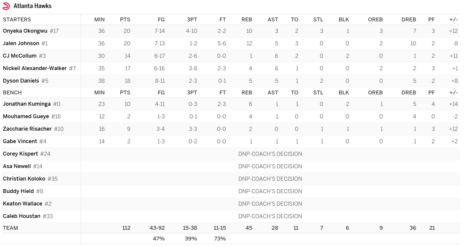 Jonathan Kuminga (Drop): This is a decent line thanks to the blocks, but not something that should get our attention, even in 16-team leagues. Kuminga has zero upside in his current 20-minute role and isn’t going to see a jump in minutes next week with the Hawks still having plenty to play for. Atlanta will need to play their regulars until the final day of the season if they want to stay out of the play-in. Over his last six, in 20.2 MPG, Kuminga has put up just 9.2 PPG on 38.5 FG%, 1.2 3PG, 4.5 RPG, 2.0 APG, and 0.7 SPG.