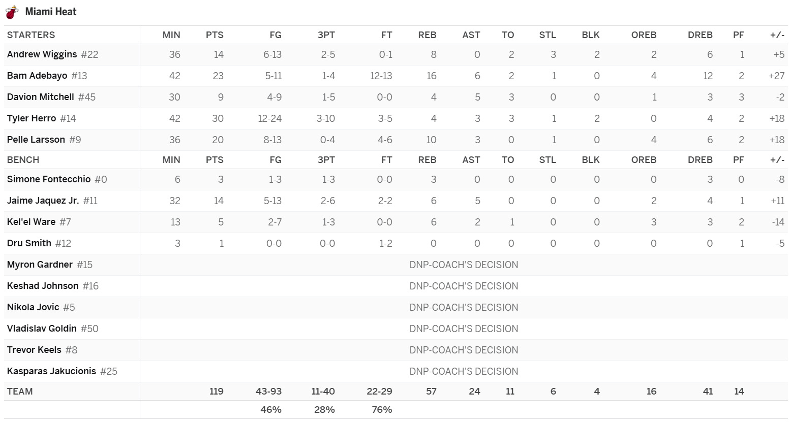Jaime Jaquez Jr.: Jaquez and all of the other Heat role players will be drops after Wednesday in H2H leagues that end this week. Jaquez and Wiggins, and to a lesser extent Mitchell and Larsson, are still capable of posting useful lines, but none are worth holding through a stretch of one game in four nights. During the final week of the season, when we will see the Heat four times, Jaquez and Wiggins will be adds again, and Mitchell and Larsson will be deep league pickups.