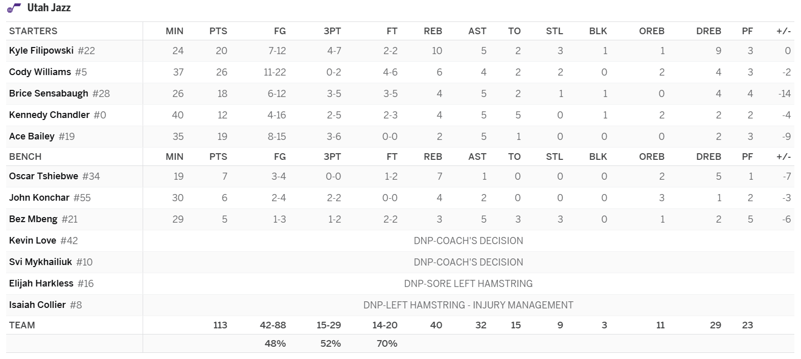 Kennedy Chandler (Pick Up): This is not a great line, but if Chandler is going to play huge minutes this week, he should be rostered in 12-team leagues. Whether or not he does will come down to Harkless’ health and if the Jazz decide to rest some of their other starters. In a big-minute role, Chandler can give us a poor man’s version of Daniss Jenkins’ line. He’s going to come with a material FG% hit, but he can help us win most of the guard categories. Through six games, Chandler is averaging 14.2 PPG on 43.1 FG%, 1.3 3PG, 3.2 RPG, 6.8 APG, 1.0 SPG, and 2.3 TOPG.