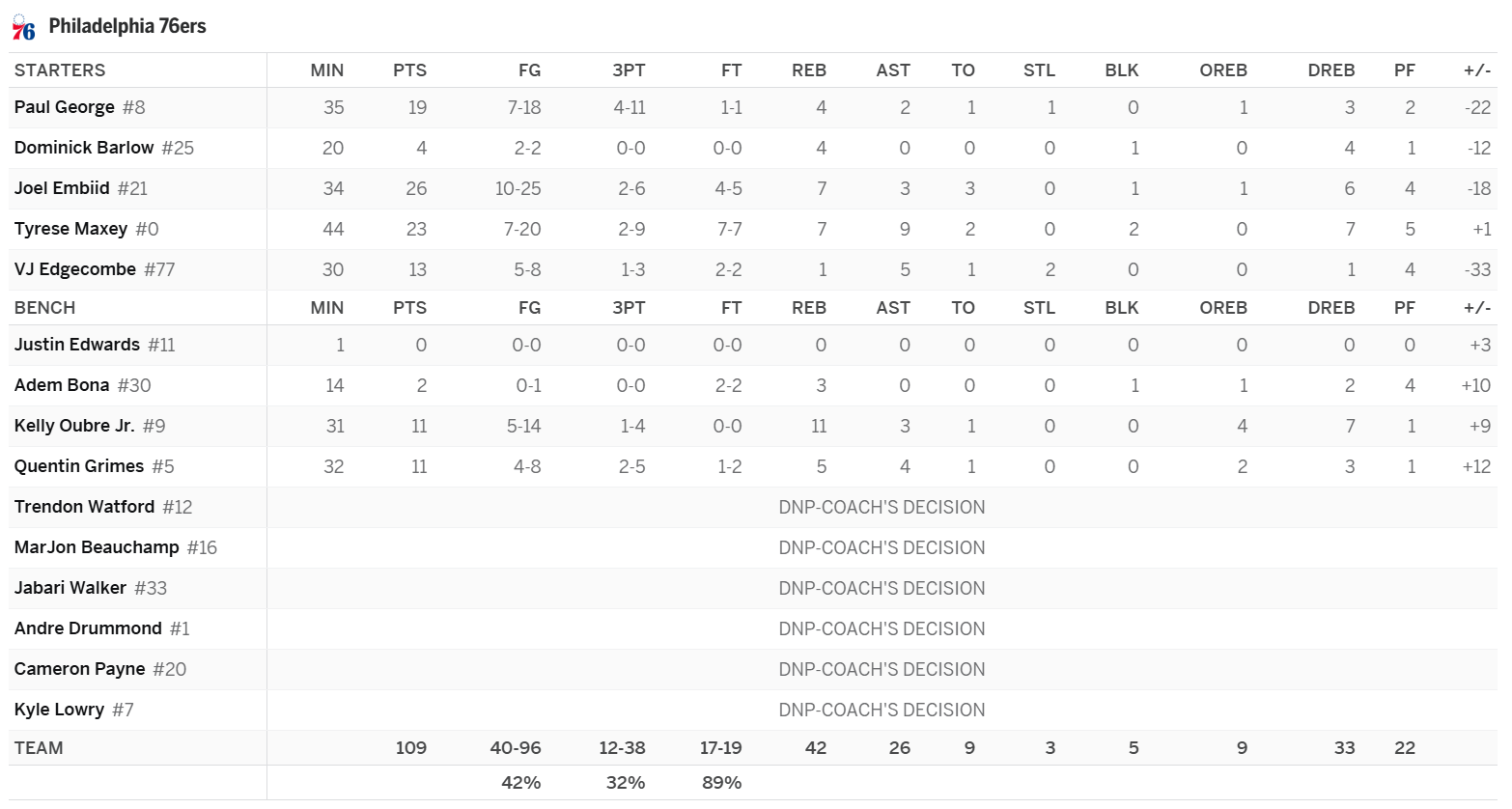 Quentin Grimes: Solid minutes for Grimes, but with Maxey, Embiid, George, and Oubre all healthy, Grimes’ usage rate isn’t going to be high enough to keep him in the 12-team conversation. The value of some players can survive hefty usage rate drops, but Grimes’ value can’t since almost all of his value is in the scoring categories. As long as the Sixers are healthy, he should be viewed as just a forgettable points and threes streamer in 12-team setups. He is not a must in 14-team leagues either.