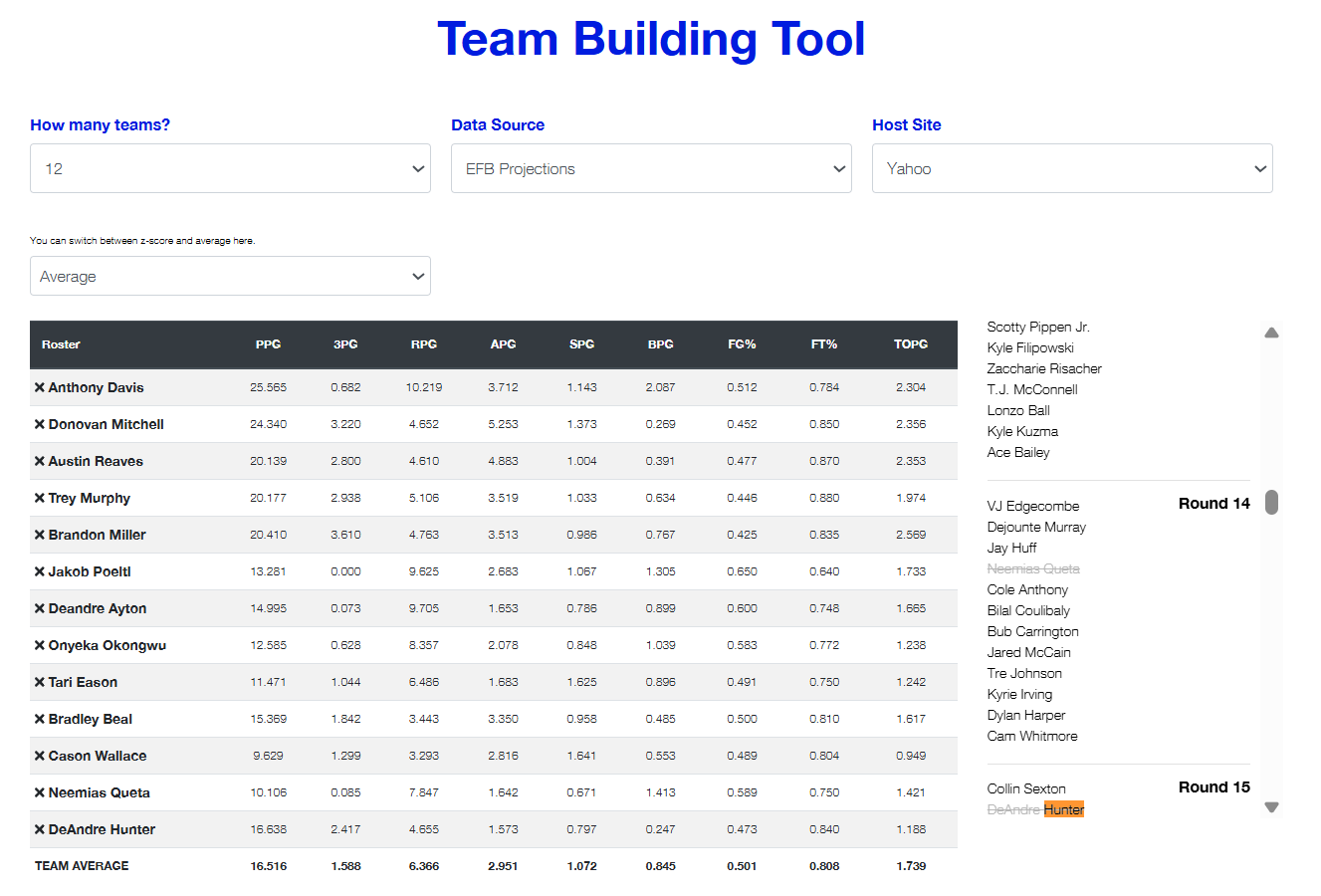 You can’t get too, too excited about a Davis-led team since you are likely to have an extended stretch or two where you are without your top pick, but I was pretty happy with this team. There are no 10/10 options if you are picking after five this year. This group is projected to be a top-two team in rebounds, steals, FG%, FT%, and turnovers, and a top-three team in blocks. I’m very happy about the team ending up in a great spot in both percentages. A punt assists team that wins both percentages consistently has a very easy path to 5. Points and threes are a player away from being where I want them. I should find that player eventually. Don’t worry about finishing the draft in a slightly weaker position than you’d like to be in a category or two. That’s almost always going to be the case in a competitive league these days. You can fix those weaknesses with a solid pickup or two.