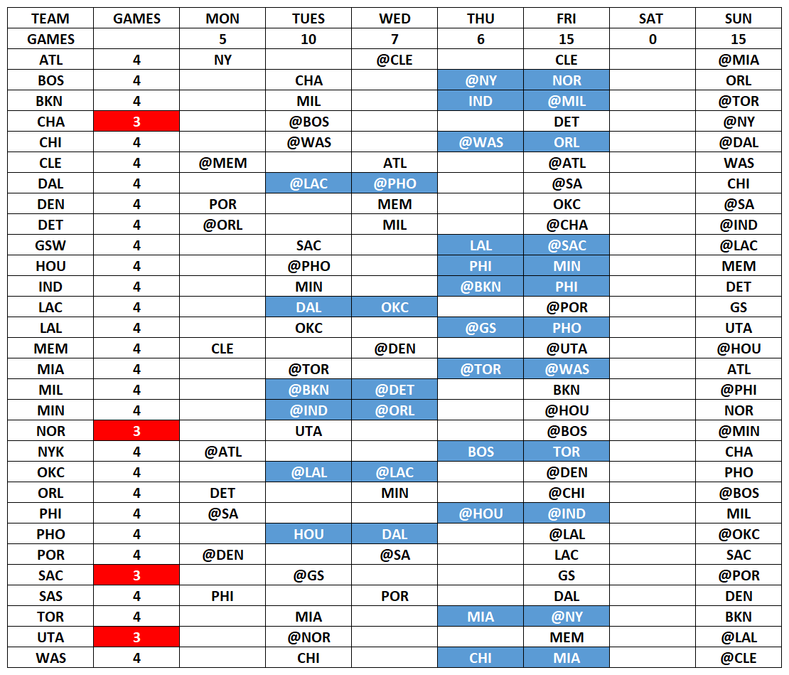 Four-game teams: ATL, BOS, BKN, CHI, CLE, DAL, DEB, DET, GSW, HOU, IND, LAC, LAL, MEM, MIA, MIL, MIN, NYK, OKC, ORL, PHI, PHO, POR, SAS, TOR, WAS